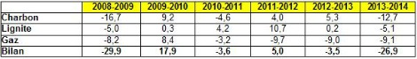 Examinons cela plus en détail. Entre 2011 et 2012, le gaz a baissé de 9,7 TWh au profit d’une augmentation de 10,7 TWh de lignite et de 4 TWh de charbon. Entre 2012 et 2013, bien que le gaz ait baissé de 9 TWh, le charbon n’a augmenté que de 5,3 TWh. En 2014, les trois sources de production ont baissé, alors que les énergies renouvelables continuaient leur développement. Dire que le recours au charbon augmente en Allemagne est donc faux. Dire que cette hausse est due aux énergies renouvelables l’est encore plus !