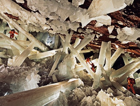 En l’an 2000, des mineurs de la compagnie Peñoles ont fait une découverte extraordinaire en forant une galerie dans les mines de Naica, au Mexique. À 300m de profondeur, ils ont trouvé par hasard une grotte dont la chambre principale contient les plus grands cristaux jamais découverts. Dans cette cavité de 30 m sur 10, de gigantesques colonnes de cristal s’entremêlent dans une configuration surréaliste qui n’est pas sans rappeler les visions de Jules Verne, ou encore la « Forteresse de la Solitude » de Superman. Le plus impressionnant des cristaux mesure 11 m de long pour un poids de 55 tonnes. Hormis son incroyable beauté, la grotte est également un endroit très dangereux pour l’homme : la température y approche les 60 °C, et le taux d’humidité y est de 100 %, ce qui fait qu’une exposition de plus d’un quart d’heure sans protection peut s’avérer fatale pour l’organisme. L’exploration de la grotte est aujourd’hui possible grâce aux opérations de pompage de la compagnie minière, mais en temps normal, elle est submergée par une eau sous haute pression saturée de minéraux, et chauffée par une poche de magma souterraine. Ces conditions extrêmes expliquent la formation de cristaux, qui n’ont cessé de grandir durant des millénaires.