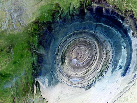 Également surnommée « l’œil de l’Afrique », la Structure de Richat est une gigantesque formation circulaire de 50 km de diamètre située en plein désert du Sahara, près de Ouadane (Mauritanie). Vue du ciel, elle ressemble à un monumental œil bleu-vert, ou à un fossile géant. Elle fut découverte lors d’un vol spatial Américain, en 1965, et à cause de sa taille et de son aspect caractéristique, elle est longtemps restée un point de repère pour les astronautes. On pensait à l’origine que la Structure de Richat était due à l’impact d’une météorite, mais cette théorie n’expliquait pas la relative platitude de la formation, dont les dénivelés atteignent environ 40 m. L’interprétation la plus couramment acceptée aujourd’hui est celle d’un dôme volcanique géant qui se serait effondré sur lui-même au cours d’une érosion de plusieurs millions d’années. Cependant, jusqu’à ce que les hypothèses soient confirmées, l’origine exacte de ce phénomène unique reste une énigme pour les chercheurs.