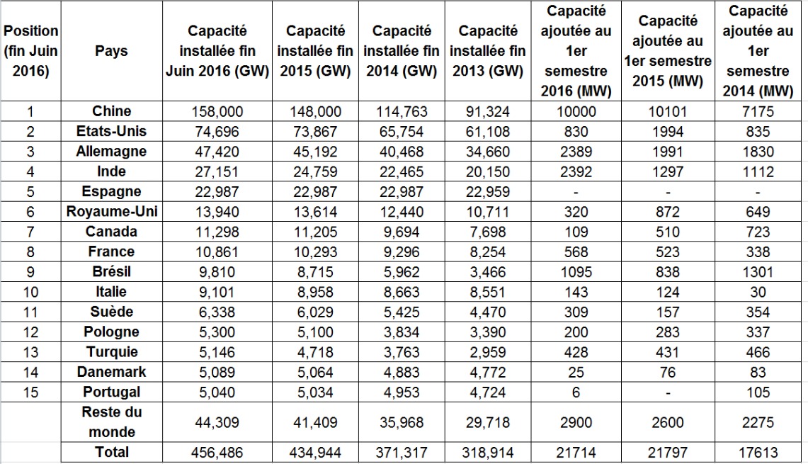 La croissance mondiale de l’éolien est poussée par la Chine qui représente 46% des nouvelles capacités au premier semestre. Fin juin 2016, la puissance installée en Chine atteint 158 GW, soit 35% des capacités mondiales.
