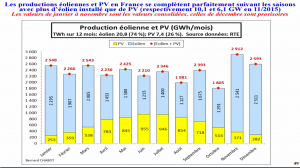– « étant donné que ces deux filières vraiment durables sont parfaitement complémentaires à l’échelle saisonnière ». On en arrive au tour de magie des statistiques. Si l’on compare les productions éolien + PV entre octobre et novembre, voit bien la forte fluctuation d’un mois à l’autre. On passe ainsi de 1805 GWh à 2912 GWh, soit une variation de presque 62% entre deux mois consécutifs. Encore une fois, 2 mois représentant les 2/3 d’une saison, j’ai connu mieux comme complémentarité et régularité. Prenez également en compte que ce sont des données mensualisées. Lorsque l’on conduit le réseau en temps réel, il faut la puissance requise à l’instant T et non pas se dire qu’une montée de production à la fin du mois va sauver la mise…