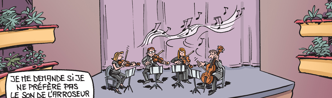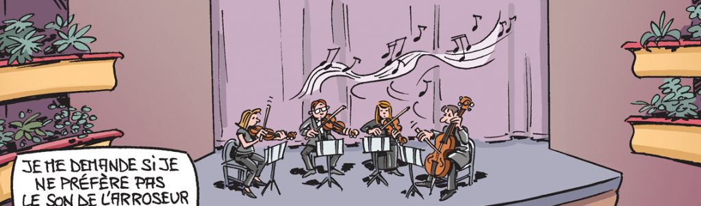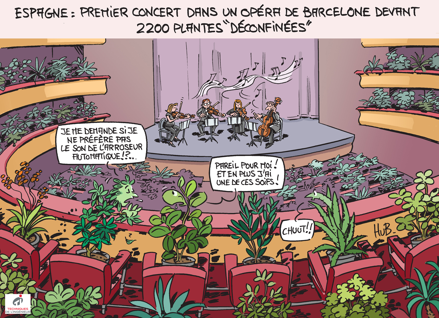 Chaque mois, le dessinateur Hubert Blatz croque l'actualité... Ce mois-ci, l'opéra de Barcelone a trouvé une alternative insolite pour remplacer le public...