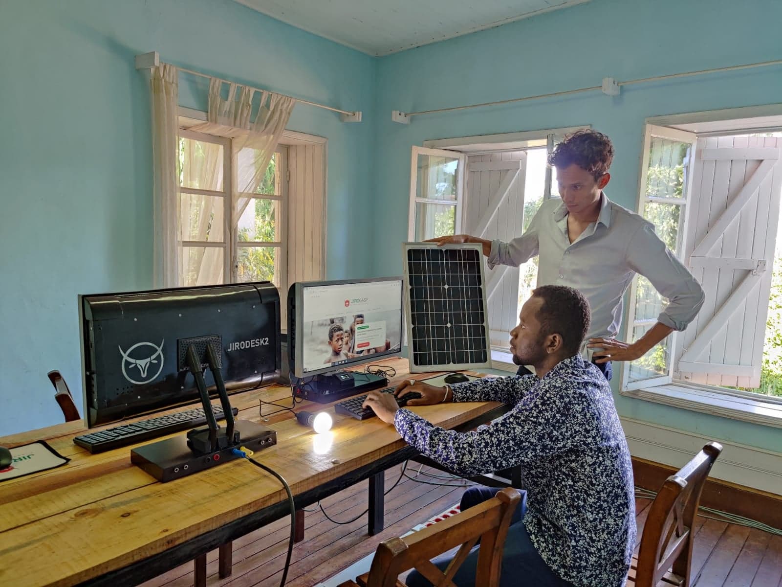 Nous produisons des générateurs solaires et des ordinateurs solaires – dont l’ordinateur solaire tout-en-un Jirodesk 2 – notre dernier produit. Une des innovations autour de ce produit est d’avoir intégré un régulateur solaire, un ordinateur ainsi que nos différents systèmes d’alimentation et de remontée de données en un seul produit. Cet appareil est particulièrement utile dans les zones dépourvues d’électricité car il est facile d’utilisation et totalement autonome (ses batteries sont reliées à des panneaux solaires pour une autonomie de cinq heures). Avec un disque dur de 64 Go, un processeur Intel Celeron de 4 Go et un écran de 21 pouces, il permet d’effectuer tous les travaux bureautiques nécessaires (via Windows 10), et d’apporter de l’électricité et de l’éclairage pour un foyer de 2 à 3 pièces grâce au surplus d’électricité produit par les panneaux solaires.