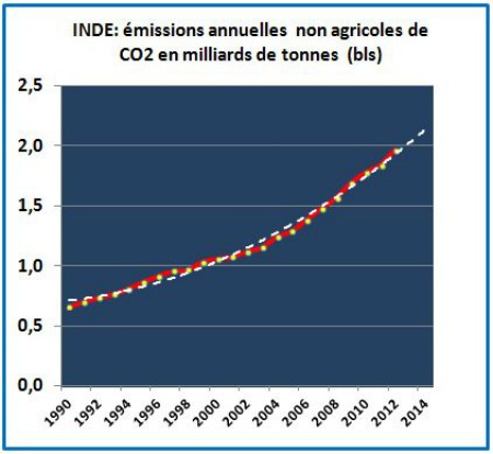 L’Inde produit son électricité de base essentiellement à l’aide de centrales au charbon, situées dans les ports et alimentées en charbon importé. Les problèmes de logistique au sein de ce vaste continent l’empêchent de brûler le charbon local et abondant. En 2014, ce pays va allègrement émettre plus de 2 milliards de tonnes de CO2 (Figure.1) qui, pour en mesurer l’importance, doivent être rapportées à des émissions mondiales non agricoles qui devraient atteindre les 40 milliards de tonnes durant la décennie à venir.