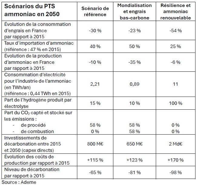 Pour rendre la décarbonation de la filière ammoniac ambitieuse, le plan de transition sectoriel (PTS) établi par l’Ademe prend en compte plusieurs paramètres : l’évolution des consommations de produits azotés dans l’agriculture et la chimie, l’apparition de nouveaux usages (transport maritime en particulier), les niveaux d’importation des différents produits, le déploiement de solutions techniques matures et d’autres moins matures comme le captage et stockage du carbone (CSC) pour réduire les émissions dues au méthane, ou le recours à de l’hydrogène produit par électrolyse de l’eau à la place du vaporeformage.