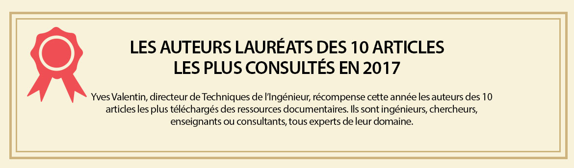 Yves Valentin, directeur de Techniques de l’Ingénieur, récompense cette année les auteurs des 10 articles les plus téléchargés des ressources documentaires. Ils sont ingénieurs, chercheurs, enseignants ou consultants, tous experts de leur domaine ; ci-dessous les auteurs à qui nous avons le plaisir de remettre un diplôme pour l’année 2017 :