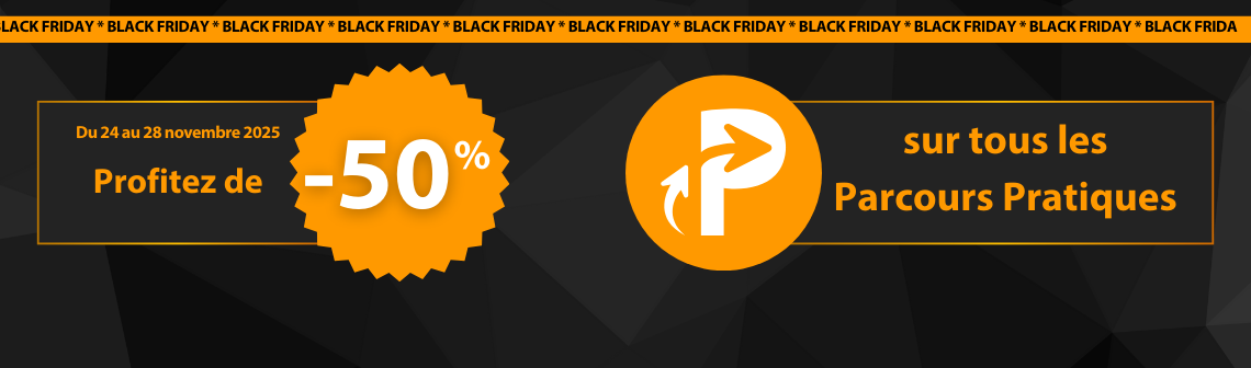 À l’occasion du Black Friday, les Parcours Pratiques sont mis à l’honneur du lundi 24 au vendredi 28 novembre 2025. Durant cette période, bénéficiez de 50% de remise sur l’ensemble des Parcours Pratiques grâce au code promotionnel BLACKFRIDAY50.