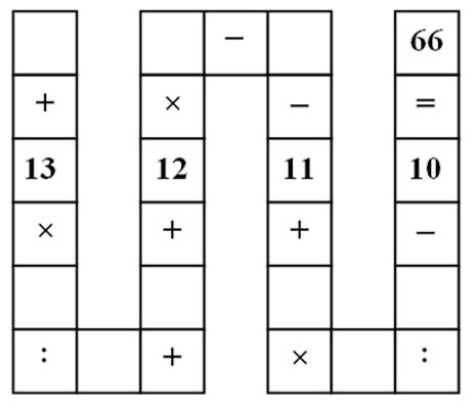 Il s’agit d’un serpentin de 27 cases illustrant une série d’opérations simples aboutissant au résultat 66. Pour arriver à ce chiffre, le calcul comporte 4 additions, 3 soustractions, 3 multiplications, 2 divisions et met en jeu 13 nombres. Parmi eux, 4 sont connus (13, 12, 11 et 10). L’objectif est de retrouver la place des chiffres manquants compris entre 1 et 9, chacun n’étant utilisable qu’une seule fois.