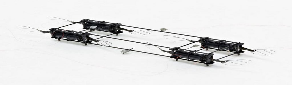 L’équipe a conçu un module à ailes battantes de 160 mg pouvant être assemblé à un autre module pour créer des robots de différentes configurations. Celui-ci est alimenté par un actionneur à élastomère électroactif diélectrique multicouches – des matériaux souples qui se déforment lorsqu’un champ électrique est appliqué – d’une puissance massique (rapport puissance/masse) de 600 watts par kilogramme. Les chercheurs utilisent la résonance du système pour éliminer les courants harmoniques dus à la présence de charges électriques non linéaires.