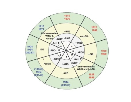 Après le pic des températures à la fin de la décennie 90, la température de surface hémisphérique a commencé à décliner, mais les hautes latitudes de l’océan Atlantique nord ont continué à se réchauffer et la surface de la banquise a continué à décliner. D’après l’hypothèse de l’onde de stade, cette tendance marque une période de transition à l’issue de laquelle les futures décennies verront l’océan nord-Atlantique commencer à se refroidir et la banquise de la région eurasiatique de l’Arctique commencera a rebondir.