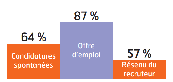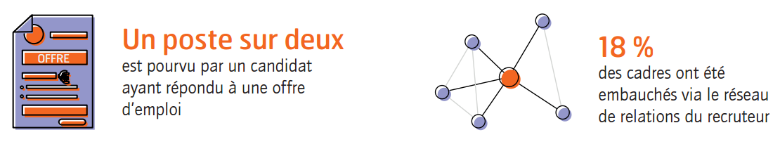 La moitié des recrutements de cadres est finalisée grâce à la diffusion d’une offre d’emploi. La part des postes pourvus grâce au réseau de contacts personnels et professionnels du recruteur est de 18 %. Les candidatures spontanées sont à l’origine de 8 % des recrutements et la cooptation par les salariés pour 7 %.