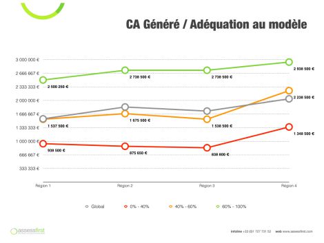 Ici, le graphique montre la corrélation entre un profil type et le chiffre d’affaires : plus le nouveau collaborateur correspond au profil type, plus le CA est haut.