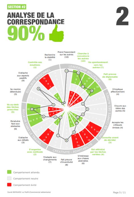 Ici le graphique montre la correspondance entre les traits d’un personnalité d’un candidat et ceux du profil type « commercial sédentaire ».