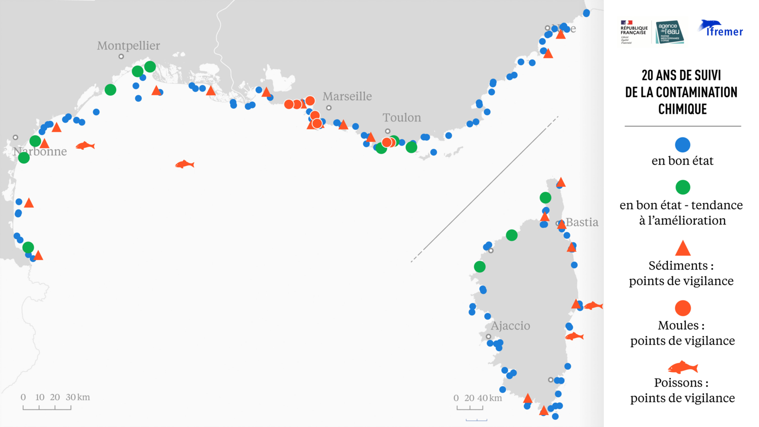 L’Agence de l’eau Rhône Méditerranée Corse et l’Ifremer ont récemment réalisé un rapport sur le bilan de 20 ans de suivi de la contamination chimique des eaux côtières méditerranéennes. Selon les experts rencontrés en juillet lors d’un point presse à l’Ifremer de Toulon, la contamination en Méditerranée est stable, et 90 % des points suivis présentent des niveaux au-dessous des seuils réglementaires environnementaux.