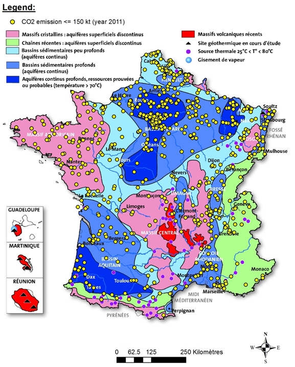 Le projet a constitué un inventaire des sites industriels potentiellement compatibles avec cette technologie, c’est-à-dire émettant moins de 150 000 t/an de CO2 et situés au droit de ressources géothermales avérées. Sur les 800 émetteurs recensés en France, plus de 650 sites industriels compatibles ont pu être identifiés, notamment dans les bassins Parisien et Aquitain. Cela représente un total de 25 millions de tonnes de CO2/ an, soit tout de même l’équivalent de près de 17% des émissions industrielles nationales de CO2 (données 2011 du registre français des émissions polluantes).