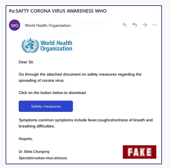 Appelée phishing (ou hameçonnage), cette escroquerie consiste à créer et à envoyer un email ayant une apparence légitime (avec la présence du logo officiel d’une organisation mondiale ou d’une ONG dans le cas du COVID-19 ).