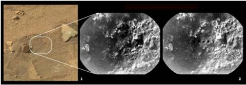 Le rover Curiosity, qui arpente le fond du cratère Gale depuis le 6 août 2012, possède à son bord des instruments inédits pour caractériser le sol martien, dont l’instrument ChemCam. Ce spectromètre de plasma induit par laser (Laser Induced Breakdown Spectrometer) couplé à une caméra (Remote Microscopic Imager) permet d’effectuer des analyses d’échelle submillimétrique de la composition chimique du sol martien, et ainsi de révéler de possibles mélanges entre pôles chimiques différents et de déterminer sa genèse.