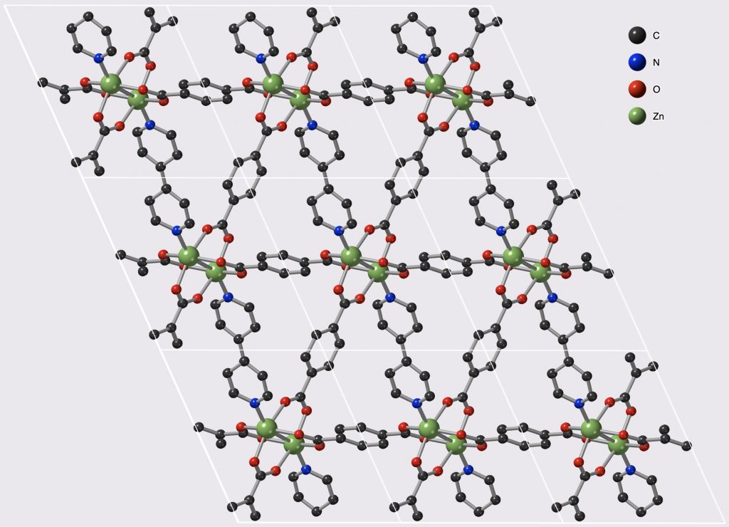 Le matériau appartient à la famille des MOF (Metal–Organic Frameworks) ou réseaux métallo-organiques en français, ces derniers étant capables de former des structures cristallines nanoporeuses. Il est constitué de briques organiques (l’acide 1,4-benzènedicarboxylique et la 4,4’-bipyridine) et de briques métalliques (le zinc). « À l’image d’un jeu de Lego, ces briques sont assemblées à l’aide de connecteurs pour créer un matériau à trois dimensions, comme une charpente, explique François-Xavier Coudert, directeur de recherche au CNRS. L’idée principale est d’utiliser une brique organique et de la lier à au moins deux métaux afin de parvenir à créer un réseau. » Une deuxième étape consiste à modifier ces briques grâce à l’incorporation de différents groupes chimiques. Plusieurs d’entre eux ont été testés, et les scientifiques ont démontré que l’ajout des groupes nitro (NO2) ou amino (NH2) permet de faire varier la gamme de pression lors du stockage de l’acétylène.