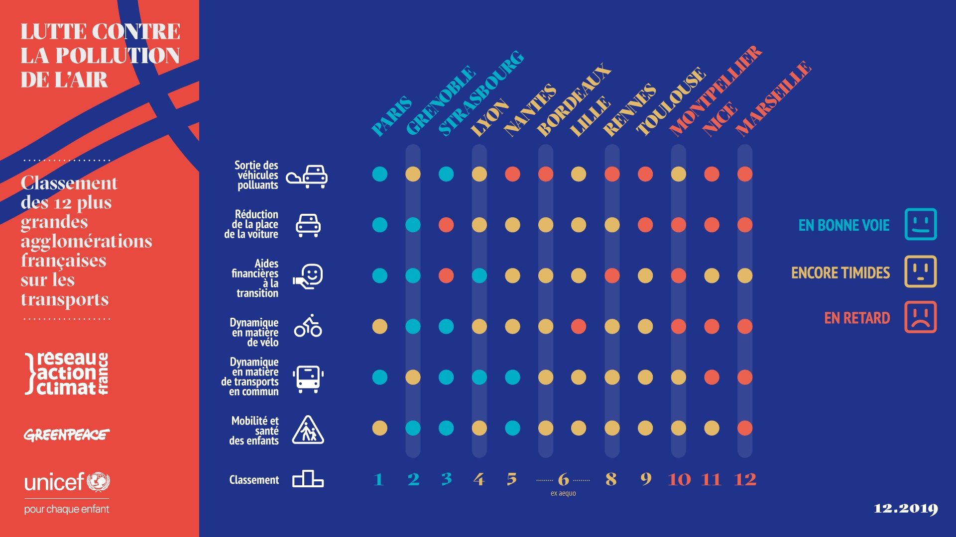 Si les grandes agglomérations commencent à s’intéresser à certains aspects de la pollution de l’air, les défis restent importants. « Aucune des grandes agglomérations françaises ne va aujourd’hui assez loin pour protéger efficacement ses habitants de la pollution de l’air », estime le rapport commun de Réseau action climat, Greenpeace et UNICEF France publié le 11 décembre. Celui-ci dresse un bilan de l’action engagée par les 12 plus grandes agglomérations françaises ces cinq dernières années en la matière.