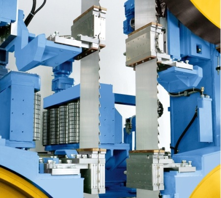 EWD, pour le Flying BandSaw (guide-lame pour scies à ruban) : Ce système permet d’atteindre un niveau de précision équivalent à celui de la coupe circulaire, tout en conservant les avantages du sciage ruban, c’est-à-dire de faibles traits de scie et une grande hauteur de coupe. Le principe est simple : remplacer le guidage pression par deux paires d’aimants, placés de part et d’autre de la lame. Celle-ci, attirée des deux côtés, se trouve ainsi maintenue au centre. La force de chaque aimant est ensuite déterminée par ordinateur, en fonction de la tendance générale de déplacement et des écarts ponctuels de la lame. Cette analyse et l’ajustement qui en découle se fait en quelques millisecondes.