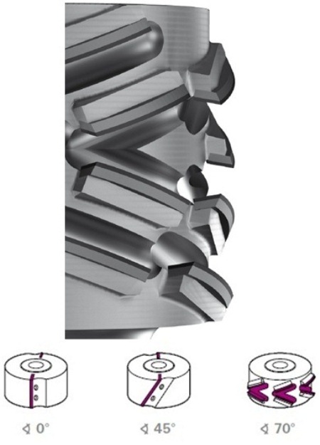 - Leuco, pour le p-System (fraise diamant pour usinage par fauchage) : La spécificité de cette fraise réside dans un angle d’axe supérieur à 55°, une première ! qui permet de faucher le bois au lieu de le racler. La dent agit ainsi comme une lame de couteau et enlève vraiment de la matière. Cette technique permet de diviser par 5 les efforts de coupe et augmente la durée de vie de l’outil. De plus, l’état de surface est nettement amélioré, sans qu’il y ait besoin de recourir à un autre traitement (ponçage, toupillage).