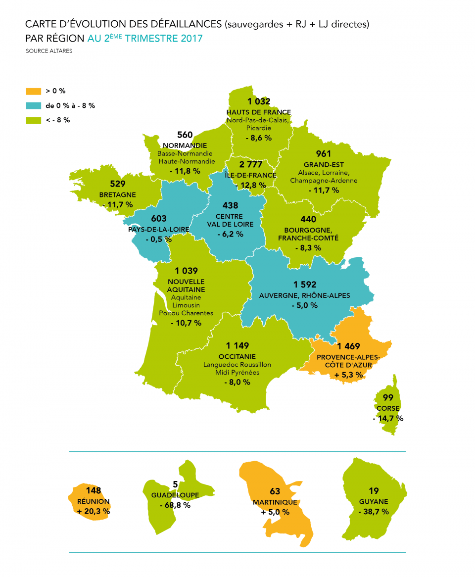 Les régions observant les meilleures dynamiques de reprise sont l’Île-de-France, la Normandie, la Bretagne et le Grand Est. La baisse du nombre de défaillances demeure très faible en Pays-de-la-Loire (-0,5%). À l’opposé, celles-ci augmentent à la Réunion (+20,3%), en Martinique (+5%) et en PACA (+5,3%).