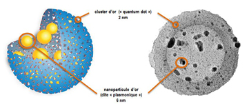 Les clusters d’or sont des nanoparticules de petite taille (moins de 2 nanomètres) possédant des propriétés intéressantes (fluorescence, production de chaleur, magnétisme), très différentes de celles de l’or massif ou même des nanoparticules d’or plus grosses. Toutefois, leur manque de stabilité en milieu aqueux (elles ont tendance à s’agréger pour former des particules plus grosses) a jusqu’à présent empêché leur utilisation en biologie et médecine. En faisant « infuser » des coques en silice poreuses avec des précurseurs d’or, les chercheurs ont réussi à former des clusters d’or dans les pores de l’enveloppe (ce qui les stabilise) et des nanoparticules d’or plus grosses dans la cavité centrale. Cette structure de « hochet quantique » est stable en solution aqueuse, pénètre au cœur des cellules sans toxicité, et préserve les propriétés optiques et magnétiques des clusters d’or, tout en permettant de maximiser leur capacité de stockage de médicament.