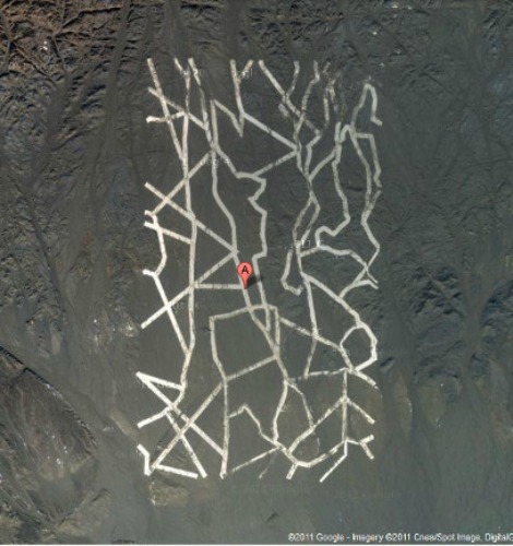 Suspectés d’être un réseau de canalisations ou un quadrillage dont l’utilisation reste mystérieuse, ces tracés ne seraient en fait que des traces de pneus, aisément reconnaissables en zoomant sur Google Earth, par le doublement des lignes et leur écartement de moins de 3 mètres. Leur incroyable régularité laisse penser à une prospection sismique, en vue de trouver, peut-être, du pétrole.