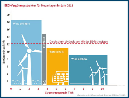 Dès 2015 l’objectif de l’EEG 2.0 est de faire baisser le niveau moyen des feed-in tarifs à 12 centimes. Quelques années plus tard, un tarif unique sera appliqué pour toutes les filières ENR : il sera de 9 centimes, ce qui sera inférieur au tarif d’achat du nouveau nucléaire EPR, 10,9 centimes le KWh, en Grande-Bretagne.
