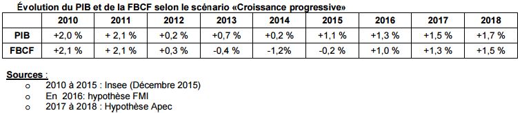Le scénario retenu table, pour les trois prochaines années, sur une « croissance progressive », avec des hypothèses de progression du produit intérieur brut de +1,3 % en 2016, +1,5 % en 2017, et +1,7 % en 2018, et s’appuie sur les analyses du FMI et de l’Insee.