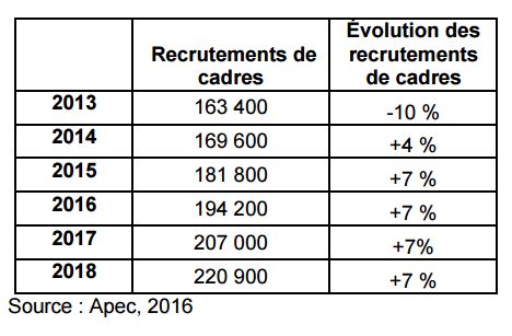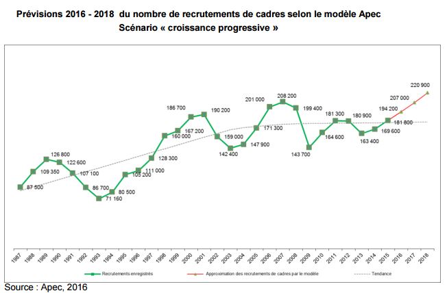 Selon l'enquête annuelle réalisée par l'Apec auprès de 11 000 entreprises, ces dernières prévoient de recruter entre 182 000 et 200 000 cadres en 2016. La progression serait comprise entre 0% et +10%, soit une médiane des recrutements à 191 000.