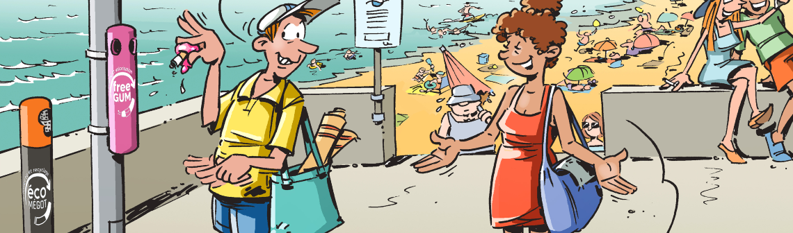 Chaque mois, le dessinateur Hubert Blatz croque l'actualité... Après EcoMégot, l'entreprise française Keenat, spécialisée dans le recyclage, lance freeGUM®. Ces bornes de récupération de chewing-gums permettent de les recycler et de les valoriser, plutôt que de joncher le sol et de polluer l'océan.