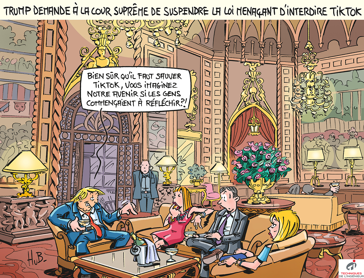 Chaque mois, le dessinateur Hubert Blatz croque l'actualité... Donald Trump prend ses fonctions ce 20 janvier, mais le futur président des Etats-Unis se positionne déjà et notamment en faveur de TikTok. Pour rappel, ByteDance, la saison mère chinoise du réseau social doit être rachetée par de nouveaux investisseurs non chinois avant le 19 janvier, sans quoi elle sera interdite aux Etats-Unis