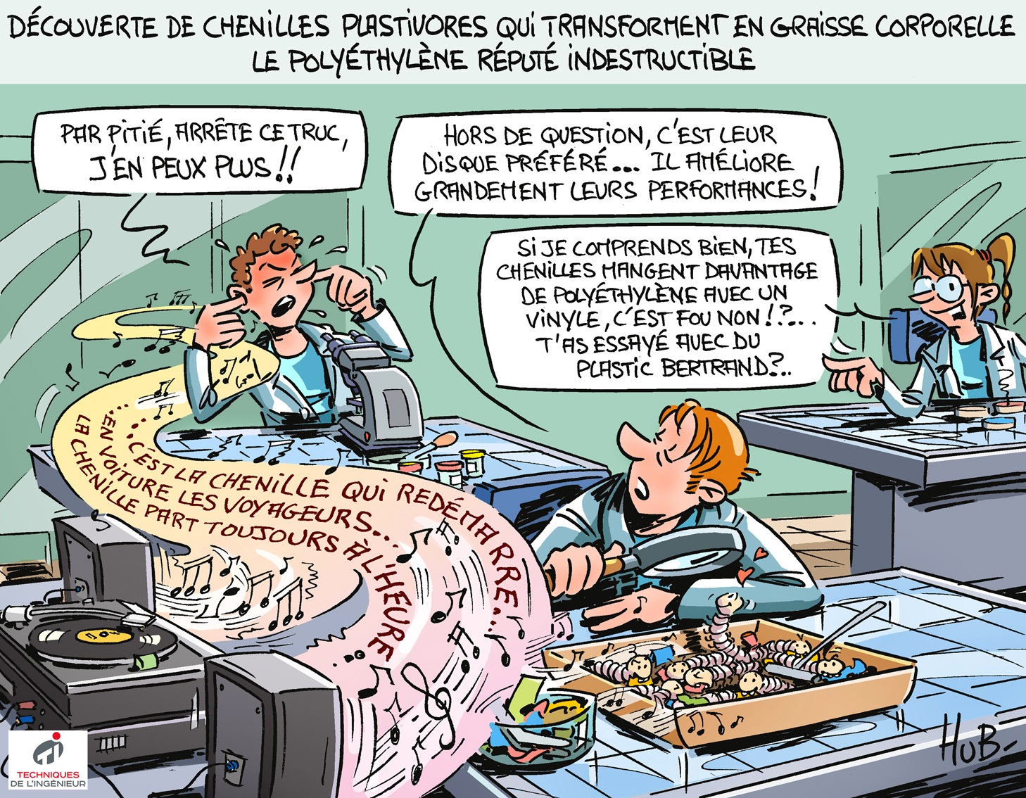 Chaque mois, le dessinateur Hubert Blatz croque l'actualité… Des chenilles pourraient-elles devenir nos alliées dans la lutte contre la pollution plastique? C’est l’hypothèse de chercheurs canadiens, dont les travaux ont mis en évidence la capacité de ces larves à dégrader puis digérer le polyéthylène, ce plastique persistant le plus utilisé dans le monde.