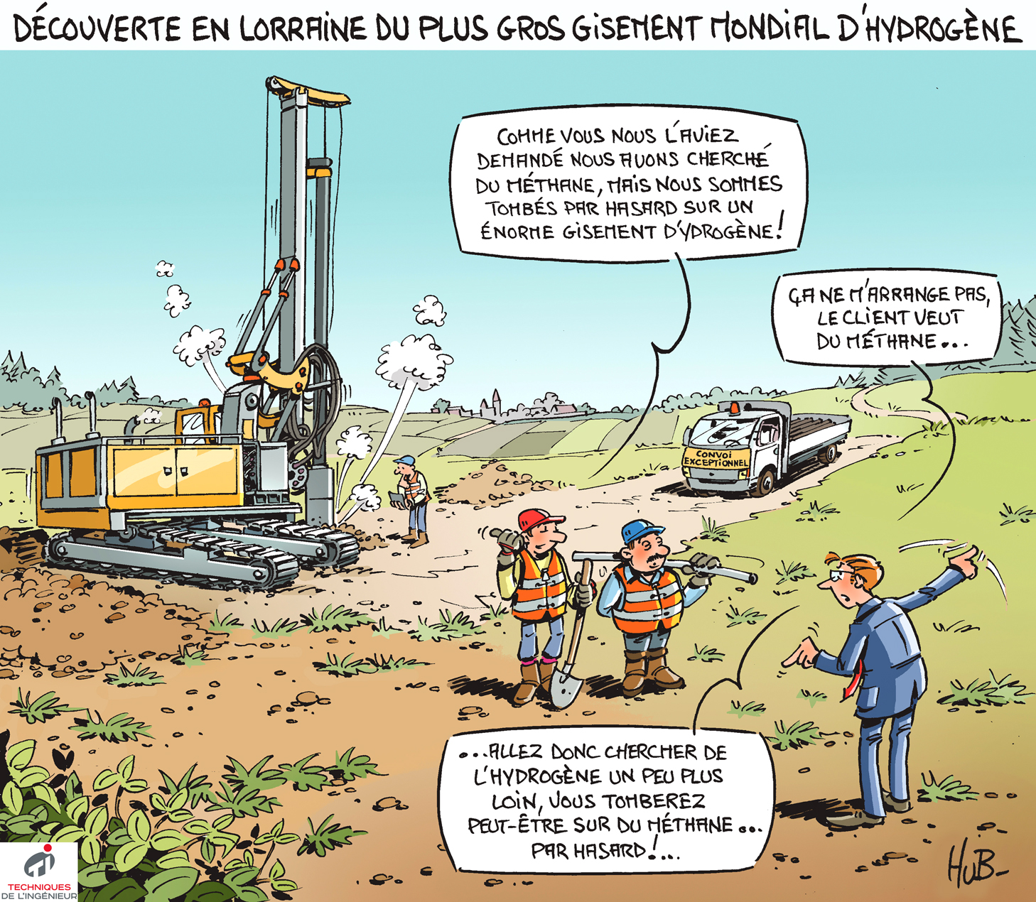 Chaque mois, le dessinateur Hubert Blatz croque l'actualité... Ce mois-ci, focus sur la découverte d'un gisement d’hydrogène naturel dans le bassin minier lorrain qui pourrait être le plus gros réservoir du monde. Ces travaux de recherche sont menés par les deux directeurs de recherche au laboratoire GeoRessources de Nancy. Si elle est confirmée, cette découverte pourrait grandement aider à assurer la transition vers des sources d’énergie propre, protectrices du climat.