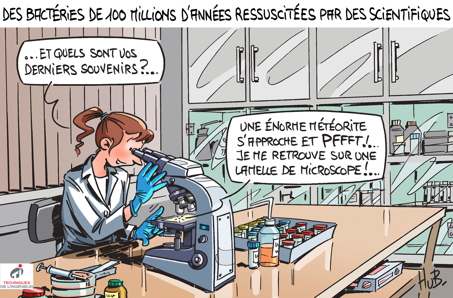 Chaque mois, le dessinateur Hubert Blatz croque l'actualité... Ce mois-ci, des scientifiques ont ressuscité des bactéries retrouvées dans le sédiment du Pacifique. Et elles ont beaucoup à nous apprendre...