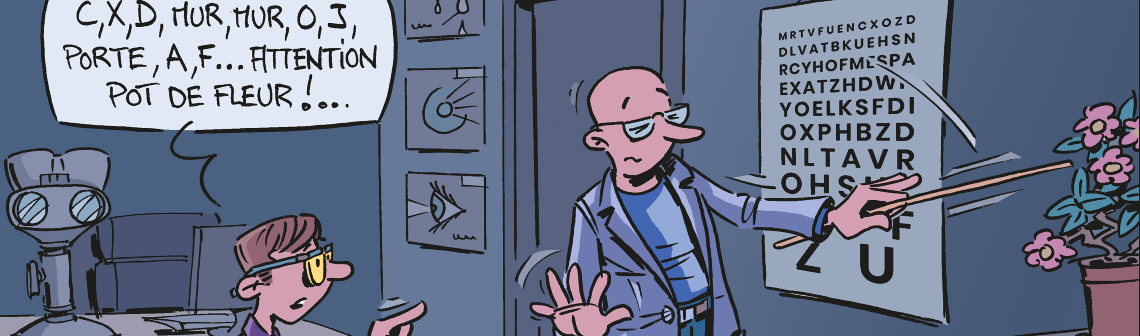 Chaque mois, le dessinateur Hubert Blatz croque l'actualité... Ce mois-ci, des chercheurs du Transformative Meta-Optical Systems de l'ARC, en Australie, ont amélioré le dispositif permettant la vision nocturne, en le miniaturisant. Un filtre infrarouge très fin, pesant moins d'un gramme, pourrait être appliqué sur le verre des lunettes, de façon à voir aussi bien de jour que dans l'obscurité.