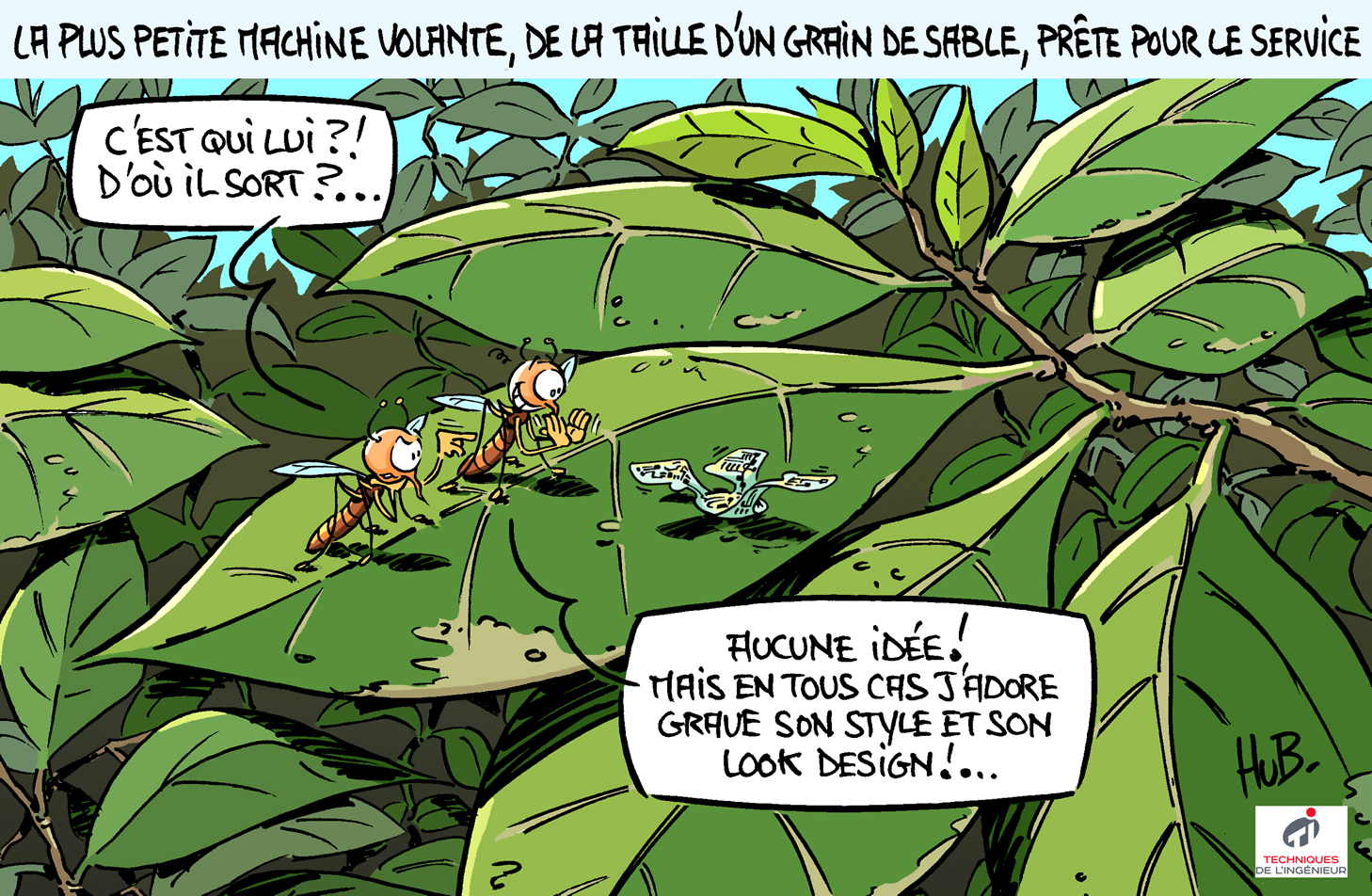 Chaque mois, le dessinateur Hubert Blatz croque l'actualité... En septembre dernier, des chercheurs américains de l’université de Northwestern ont conçu des mini-drones de la taille d'un grain de sable. De quoi faire des envieux !