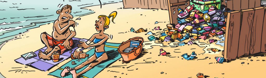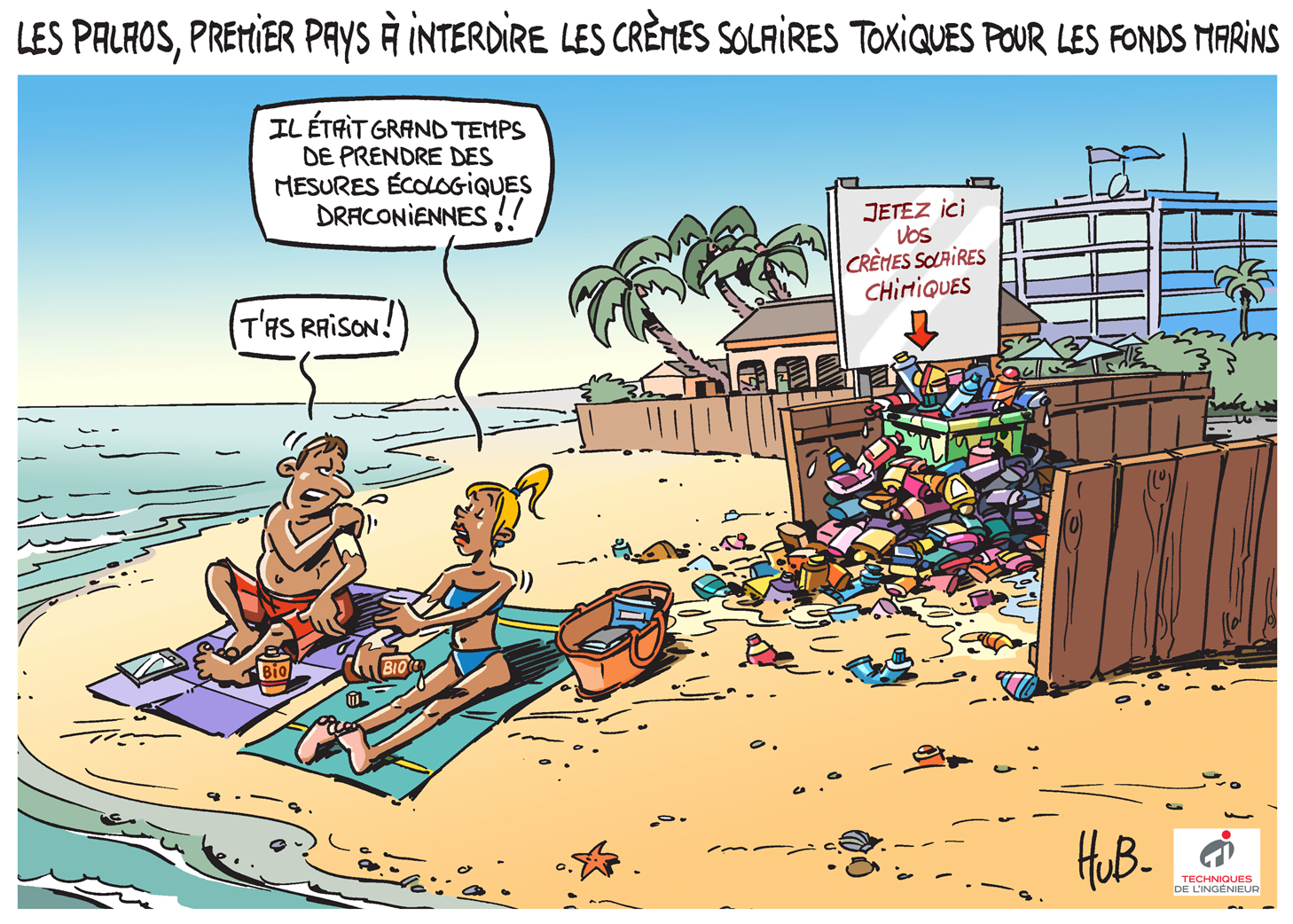 Chaque mois, le dessinateur Hubert Blatz croque l'actualité... Ce mois-ci, l'archipel des Palaos situé dans le Pacifique interdit les crèmes solaires toxiques pour protéger ses coraux. Une mesure suffisante ?