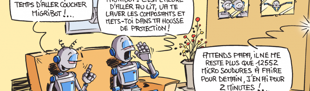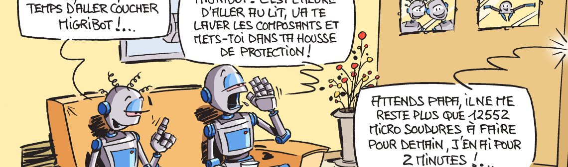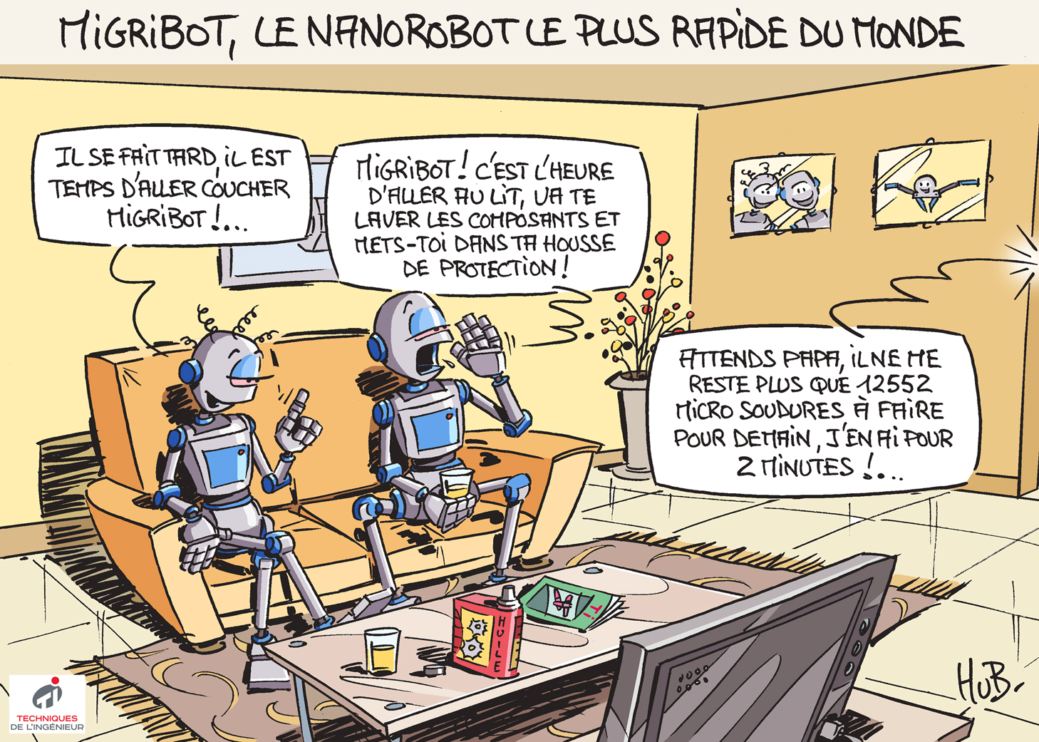 Chaque mois, le dessinateur Hubert Blatz croque l'actualité... Ce mois-ci, le nanorobot MiGriBot (Miniaturized Gripper Robot) a battu le record du monde de vitesse dans la manipulation de micro-objets. L'objectif de départ de l'équipe française derrière cette performance était la miniaturisation !