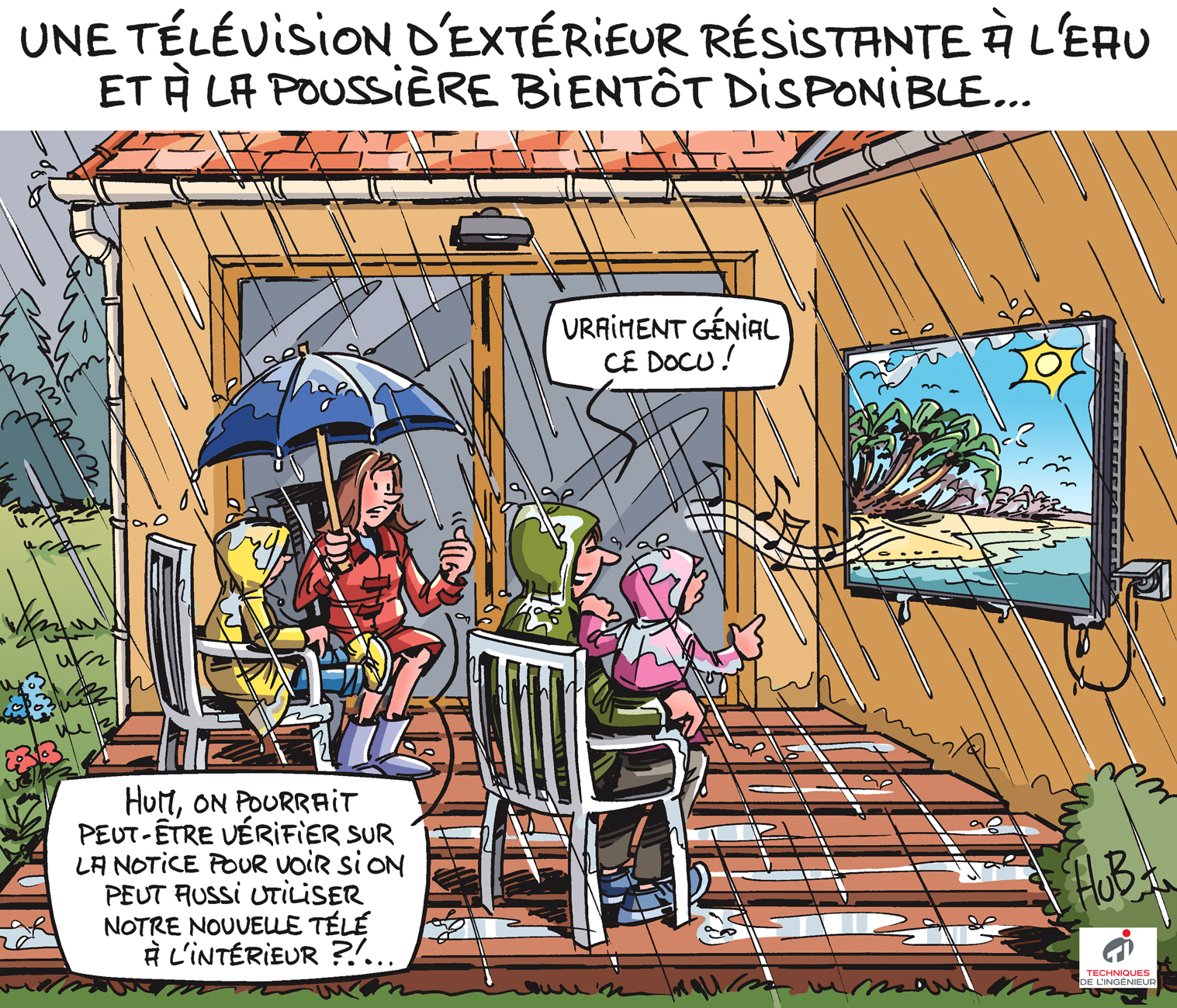 Chaque mois, le dessinateur Hubert Blatz croque l'actualité... Ce mois-ci, Samsung a imaginé une télévision résistante à l'eau et à la poussière. Une nouvelle manière de regarder ses séries ?