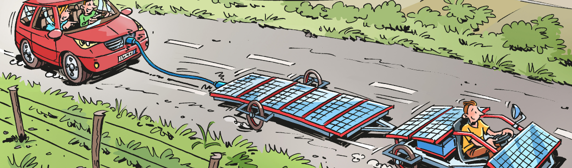 Chaque mois, le dessinateur Hubert Blatz croque l'actualité... Ce mois-ci, le YouTubeur Drew Builds Stuff a conçu un véhicule alimenté par des panneaux solaires qui le recouvrent. Ce bricoleur a donc prolongé la surface de la voiture, insuffisante, par une remorque longue de 4,2m. Celle-ci est aussi recouverte de panneaux photovoltaïques, de façon à augmenter son autonomie, qualifiée d'illimitée...