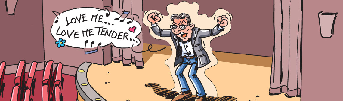 Chaque mois, le dessinateur Hubert Blatz croque l'actualité... Ce mois-ci, on vous parle de Jukebox, une intelligence artificielle qui compose de fausses chansons ressemblant à s'y méprendre au style musical d'artistes connus, dont Elvis Presley !