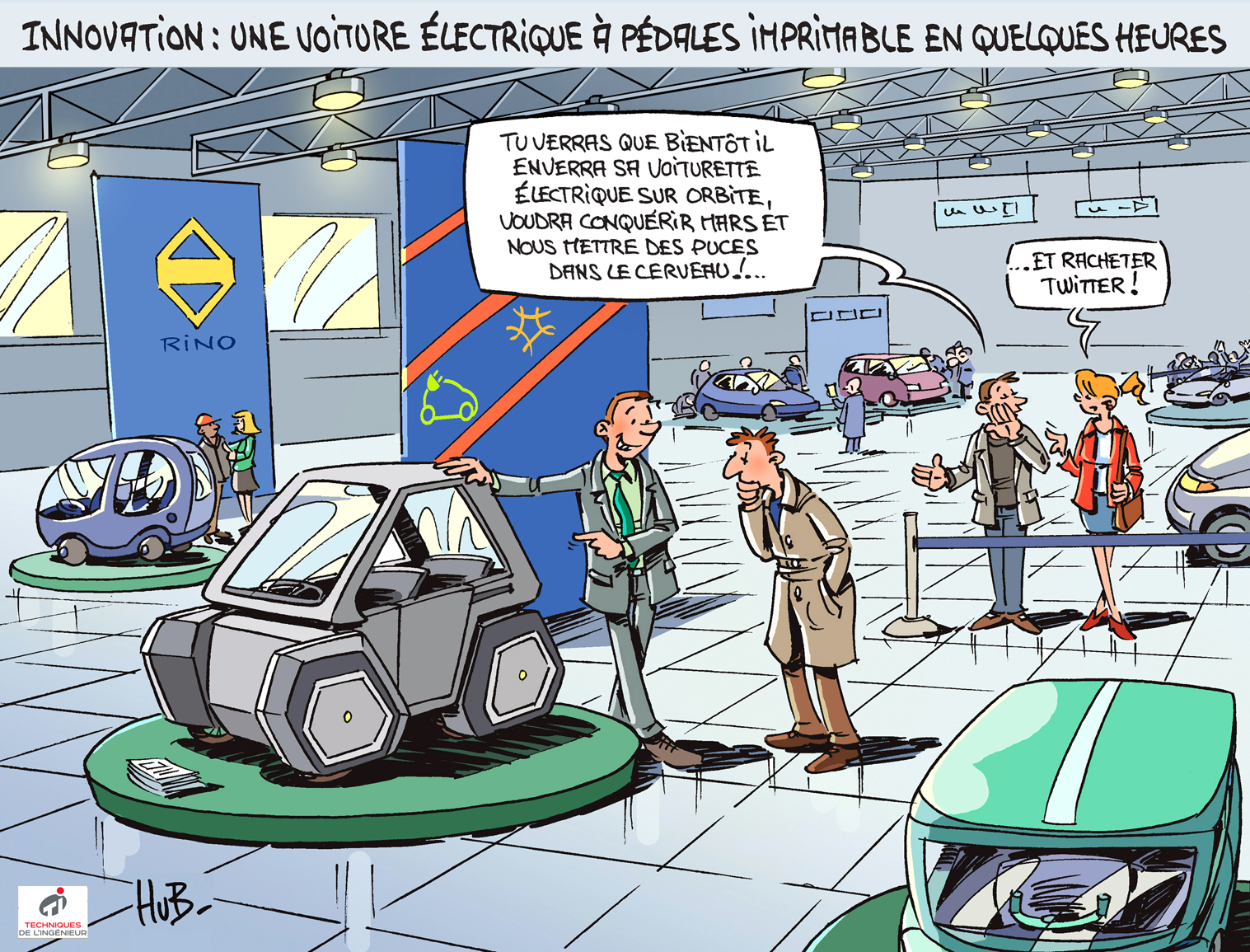 Chaque mois, le dessinateur Hubert Blatz croque l'actualité... Ce mois-ci, le quadricycle Uila, à mi-chemin entre un vélo cargo et un véhicule électrique, ne s'imprime qu'en quelques heures !
