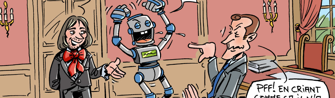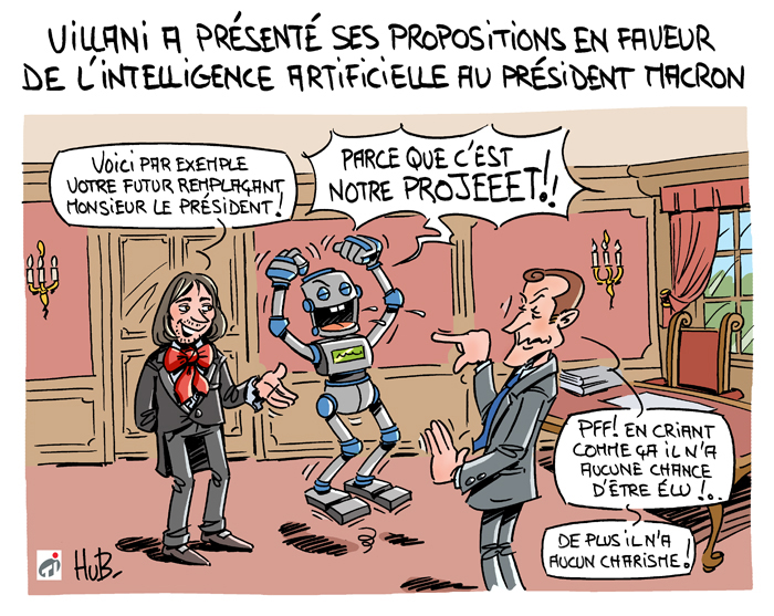 Chaque mois, le dessinateur Hubert Blatz croque l'actualité... Aujourd'hui place à l'intelligence artificielle avec les propositions de Cédric Villani