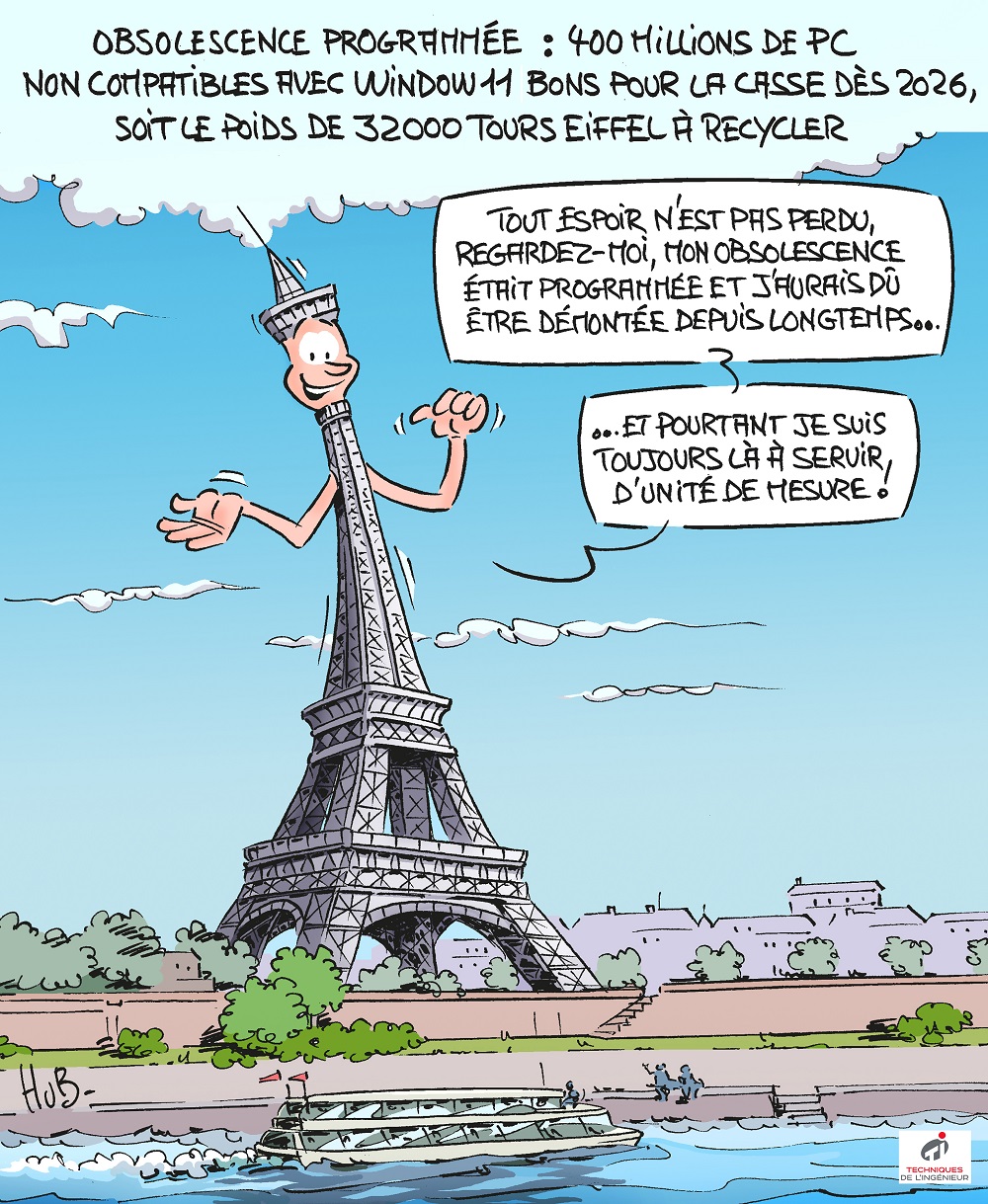 Chaque mois, le dessinateur Hubert Blatz croque l'actualité... La fin de Windows 10 n’en finit plus d’exacerber les colères. Associations et utilisateurs sont vent debout contre l’arrêt des mises à jour, fixé par Microsoft au 14 octobre 2025. Dégâts environnementaux, mises au rebut d’appareils encore fonctionnels, freins à la réduction des déchets et de l’impact numérique pourtant prônée par la firme, les conséquences de cette décision ont provoqué une levée de boucliers, au point que l’entreprise a dû revenir sur sa mesure. Temporairement !