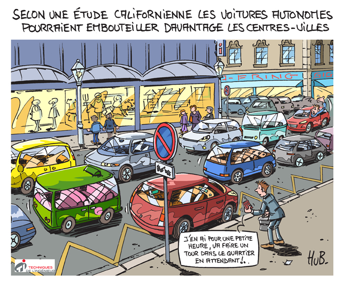 Chaque mois, le dessinateur Hubert Blatz croque l'actualité. Ce mois-ci, une étude californienne s'inquiète des conséquences de la circulation des voitures autonomes en centre-ville...