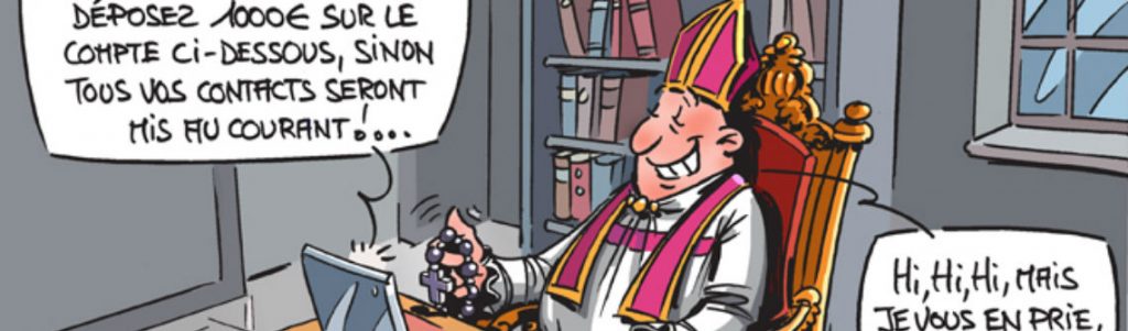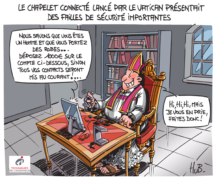 Chaque mois, le dessinateur Hubert Blatz croque l'actualité... Ce mois-ci, le Vatican lance son chapelet connecté...et expose les données personnelles des utilisateurs.
