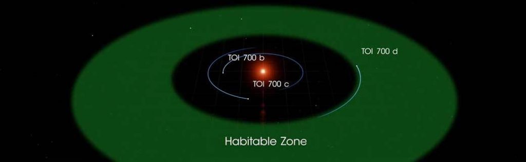Cette étoile, TOI700, est plutôt petite, à peu près 40% de la taille du soleil. 4 planètes orbitent autour de TOI700, mais seule TOI700d est à bonne distance de son astre. Les autres (a, b et c) n’intéressent donc pas les astronomes. En termes d’habitabilité s’entend.