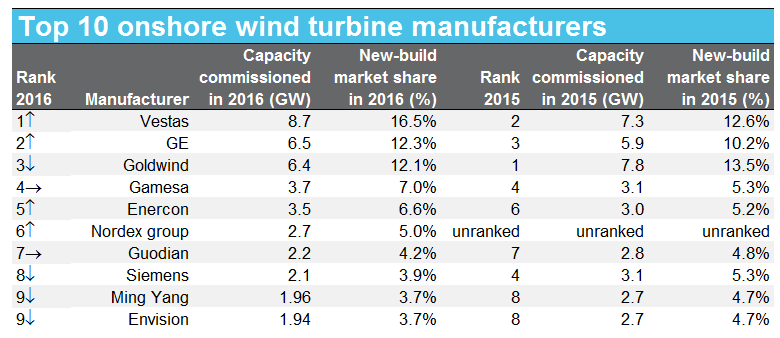 Les constructeurs européens d’éoliennes ont bien tiré leur épingle du jeu en 2016. Vestas est redevenu le leader du marché au détriment du chinois Goldwind passé en 3ème position derrière General Electric. L’Asie reste le marché le plus attractif.